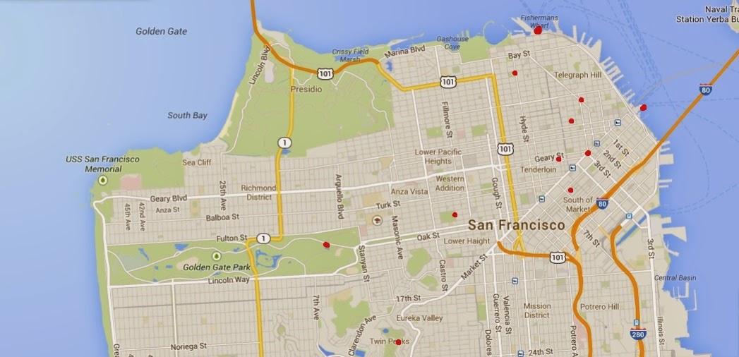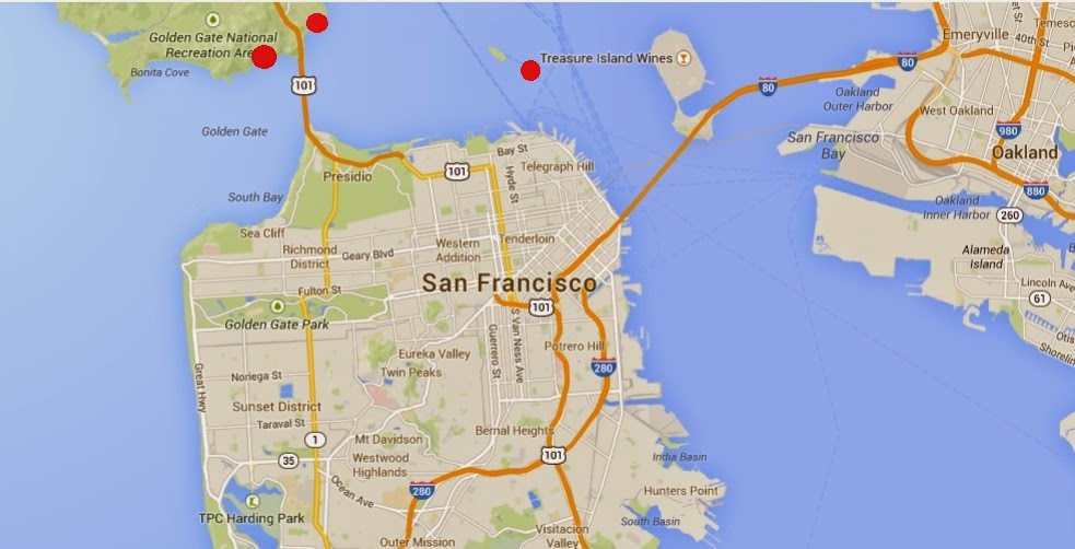 Empiezo poniendo unos mapas para que nos orientemos. Los puntos rojos se corresponden más o menos con los lugares donde hicimos las fotos de esta entrada. Pensé en ponerles números, pero creo que es más divertido tratar de adivinar dónde es cada una. En cuanto al mapa, a la izquierda está el Pacífico y a la derecha Oakland y la bahía de San Francisco. Al lado de Treasure Island se ve una manchita verde, esa es la isla de Alcatraz.