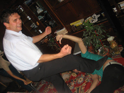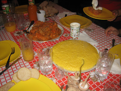 Sólo por esto mereció la pena el viaje. Como dice Carlos, no sé si es que nos hacemos querer o qué pasa que siempre que vamos por ahí nos invitan a todo. Tampoco sé cuantas horas estarían cocinando pero lo que sí sé es que estuvimos más de 4 horas comiendo, y bebiendo. Comimos tanto que tuvimos que hacer una pausa de 20 minutos a mitad. Un montón de platos de aperitivo que ya valían por dos comidas más tres platos principales. Todo ello aderezado por chupitos de palinka cada dos por tres, varias botellas de vino y una sandía a la vinagreta, un cachondeo de idiomas y el padre echando chistes después de cada chupito de palinka. Antes del postre, ronda de pulsos tumbados en el suelo contra el padre. Ninguno le pudimos.