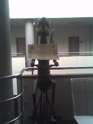 Y finalmente, aprovechando que estaba en la tercera planta de teleco y que posiblemente no vuelva a la escuela a no ser que me dé un apretón algún día paseando por los naranjos, he entregado mi título recién adquirido al Tomasulo para que lo bendijera, cual Papa con los chiquillos. Mientras él estaba en ello, yo le he hecho una foto para que quede constancia de mi desequilibrio mental: